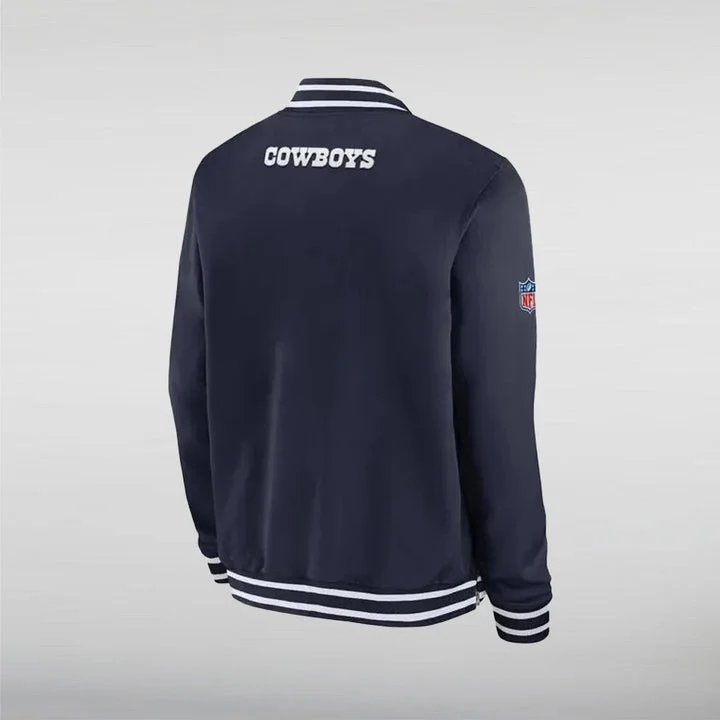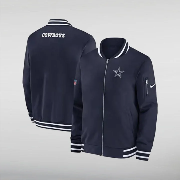 Show your Dallas Cowboys pride in style with this Bomber Jacket. Designed with a sleek navy blue finish, this jacket combines sporty performance with street wear flair. The iconic Cowboys star logo on the chest, NFL patch on the sleeve, and Nike Swoosh branding make it a must-have piece for loyal fans and collectors alike.