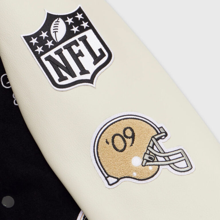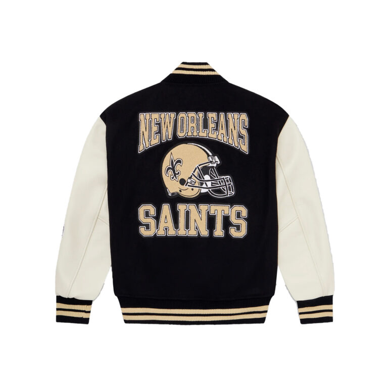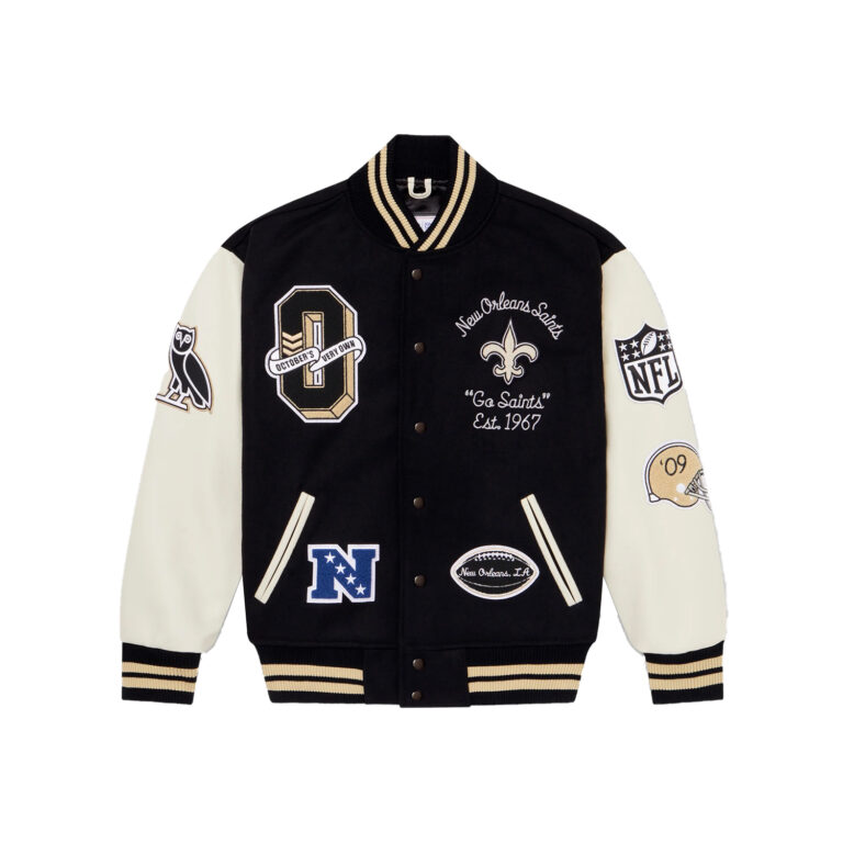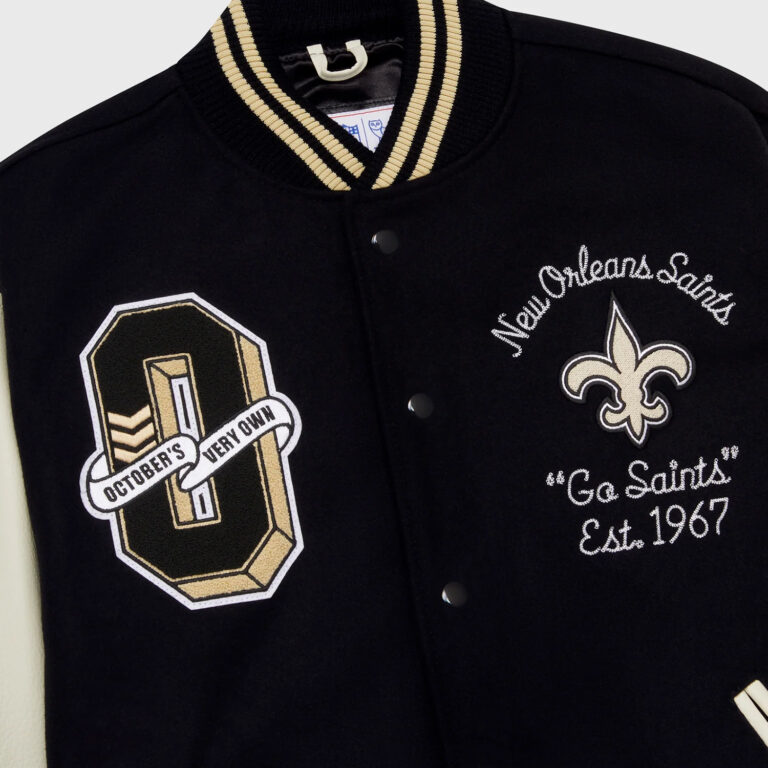 This OVO New Orleans Varsity Jacket is a collaboration between (OVO) and the New Orleans Saints. Featuring a classic varsity design with bold patches and embroidery, this jacket is a must-have for any Saints fan. Show your team pride and street wear style with this unique piece.